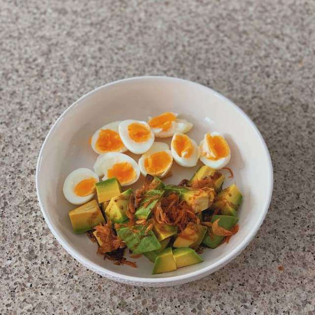 Nàng ngọc nữ màn ảnh khéo léo kết hợp bơ với trứng gà, một chút hành phi làm dậy mùi thơm của món ăn. Trong bơ có lượng calo cao khi kế hợp với trứng - nguồn protein dồi dào là món ăn đủ cung cấp năng lượng cho ngày mới. Bơ chứa nhiều chất béo nhưng lại là chất béo không bão hoà đơn, hỗ trợ tiêu hao mỡ nếu ăn với liều lượng vừa phải.
