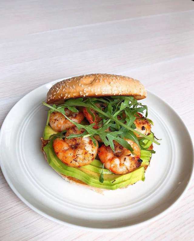 Bơ thái lát kẹp tôm áp chảo số cajun, bánh mì kẹp, cải arugula và kem phô mai đem đến món ăn vừa đẹp da vừa đẹp dáng.
